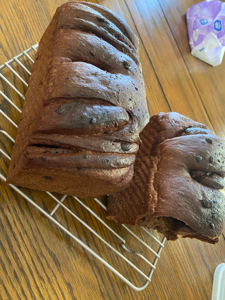 杜菁菁 做过 视频|🍫双倍浓郁|奶油巧克力🍞吐司面包 因为我的烤箱不能上下火分开控温,所以我设置成了185度,43分钟,后面也没盖锡纸,现在看来是温度高时间长了,本来今天面揉的很好,发的也很好,结果却烤糊了,外面还有点干硬,真是窝火,好在里面还不错,也很柔软,阿姨还说很好吃,哈哈,下次调整成180度40分钟试一试吧 2021-11-11