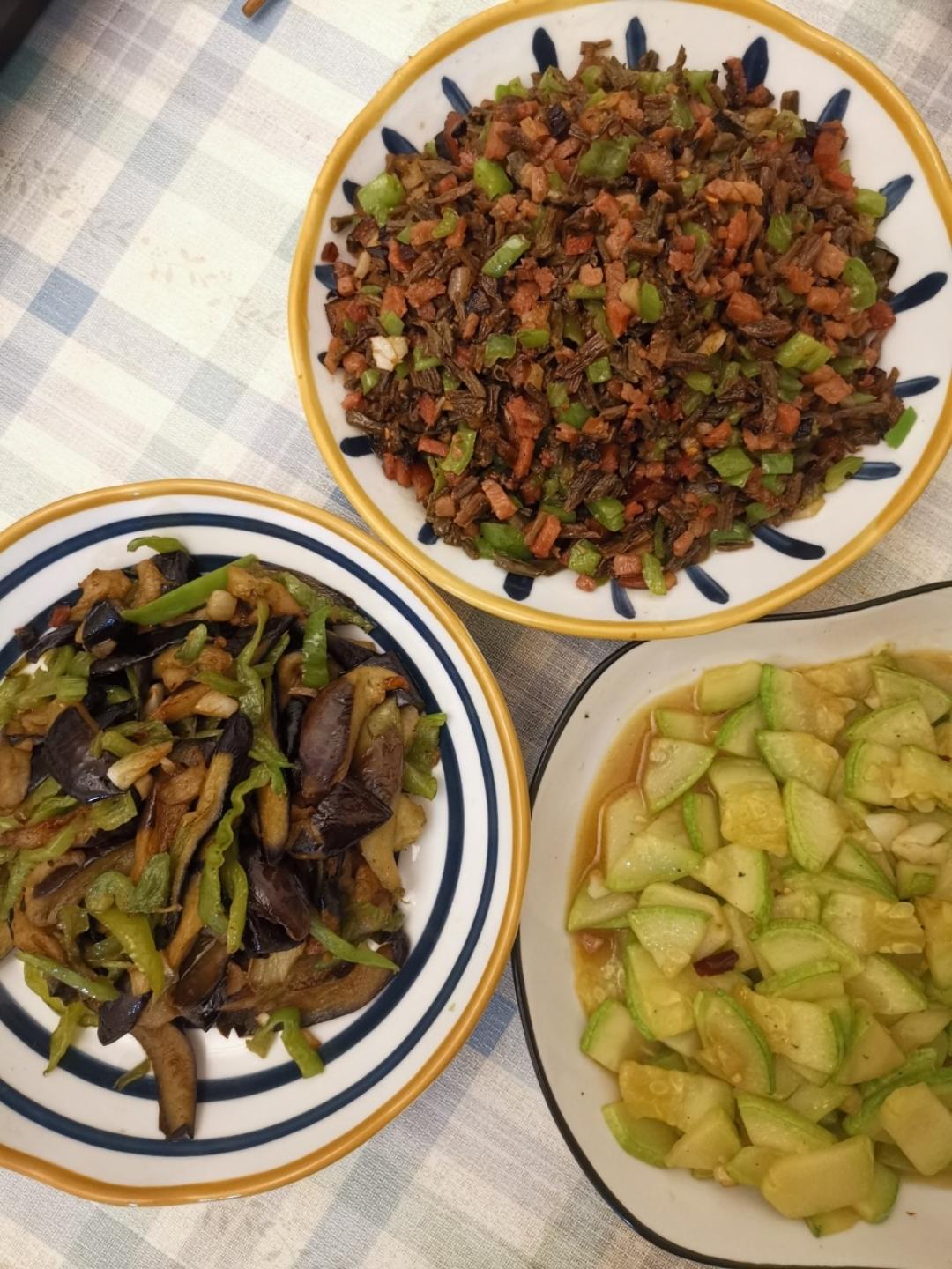 干豆角炒腊肉,青椒茄子,酸辣番瓜