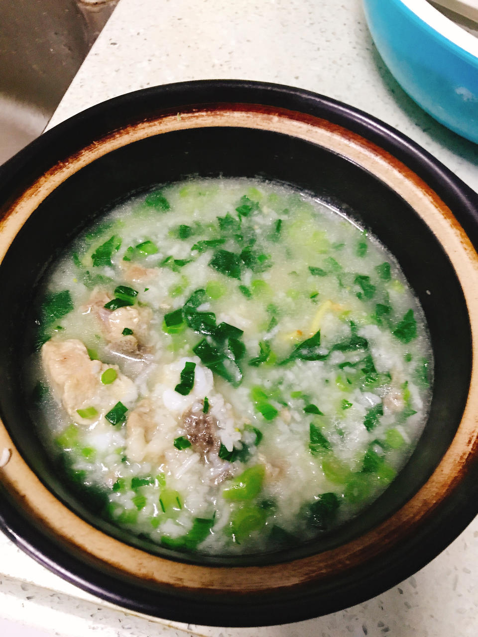 青菜排骨粥,黄酒鸡蛋。