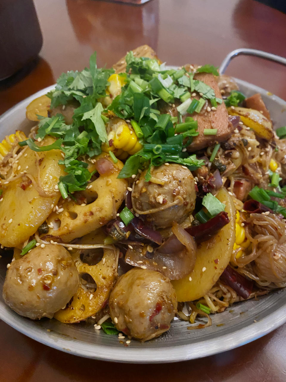 麻辣香锅,煮熟食材(8分吧),倒油加葱姜蒜辣椒花椒洋葱炒香,加底料(我用的桥头麻辣香锅不推荐),加食材就好了