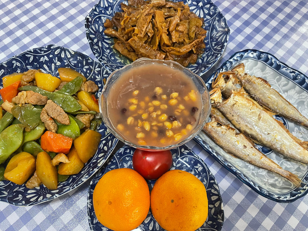 早餐马拉松2021.12.6,玉米大馇粥+炖油豆土豆+煎油扣鱼+油焖笋
