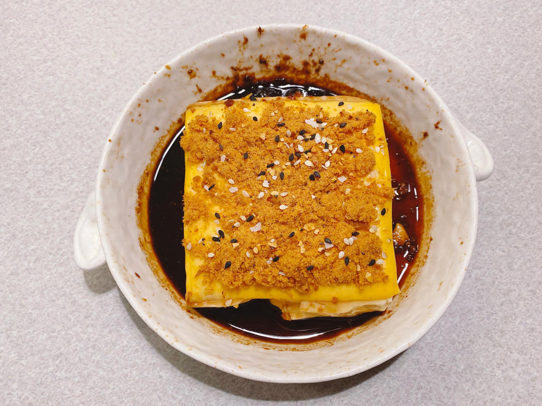 贝果咖啡店 做过 日式芝士豆腐 #晚餐•2021年12月11日# 吃惯了皮蛋豆腐换个搭配来玩一下非常好吃的日式芝士肉松豆腐✌️内酯豆腐一块 芝士片一片 三文鱼松一把撒一些海苔拌饭松 倒一点蒸鱼豉油 Done! 2021-12-12