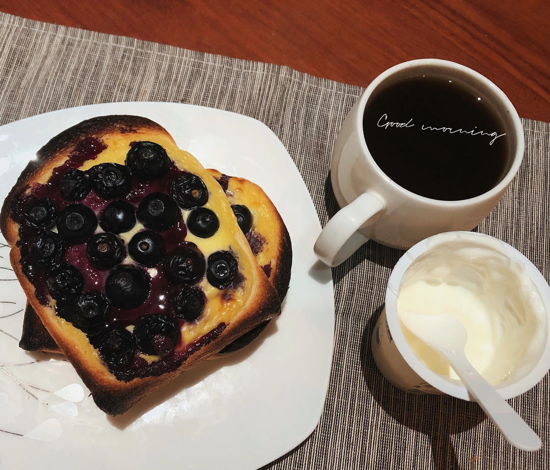 告别昨天的简单迎来今天的丰富。酸奶混合蛋黄覆盖在吐司上,摆上蓝莓,一定要烤到爆浆,好吃好吃真好吃。