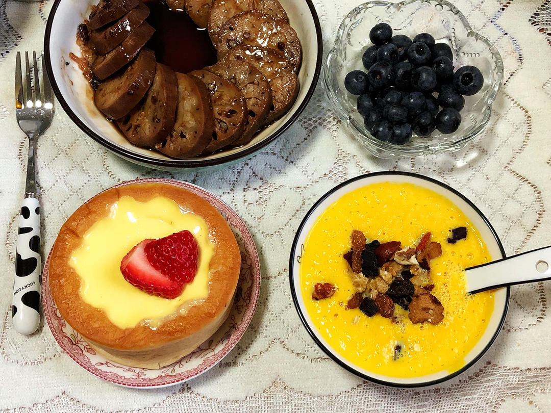 红枣桂圆牛奶南瓜糊+糯米糖藕+布丁面包+蓝莓