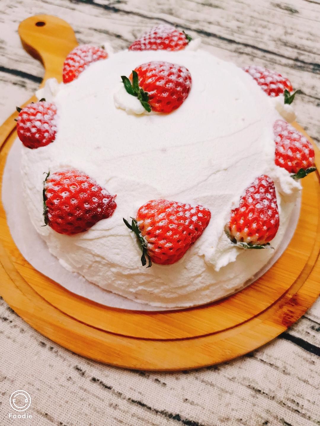 八寸蛋糕胚切三层用其中两片,中间奶油和草莓碎填“瓷实”点,切开更好看