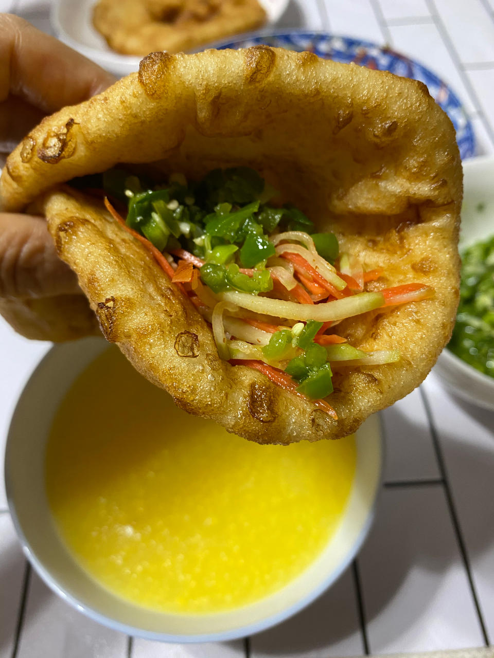 传个在直播间炸的油饼,第二天还是软的,配上凉拌萝卜丝和蒜青椒绝了