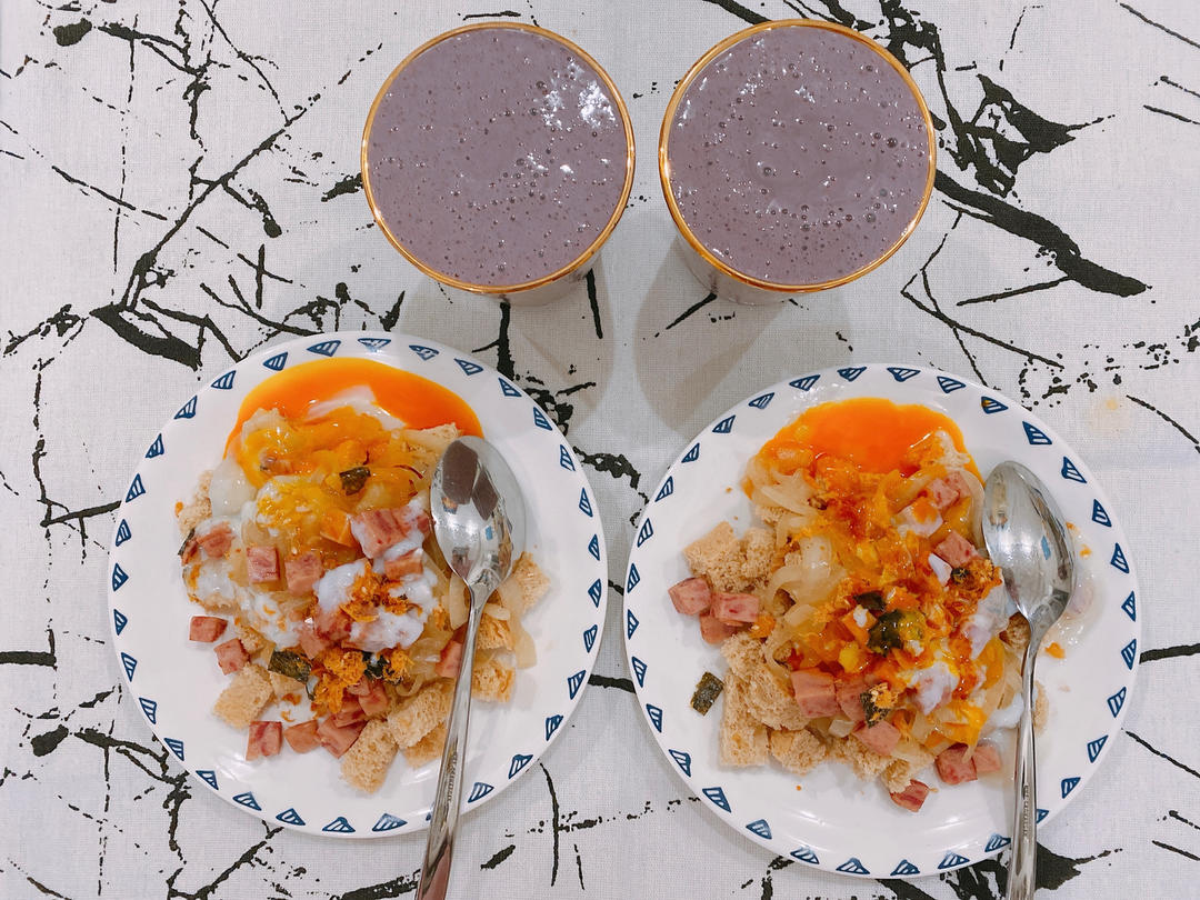 今日早餐:温泉蛋午餐肉洋葱吐司丁、香蕉浆果奶昔