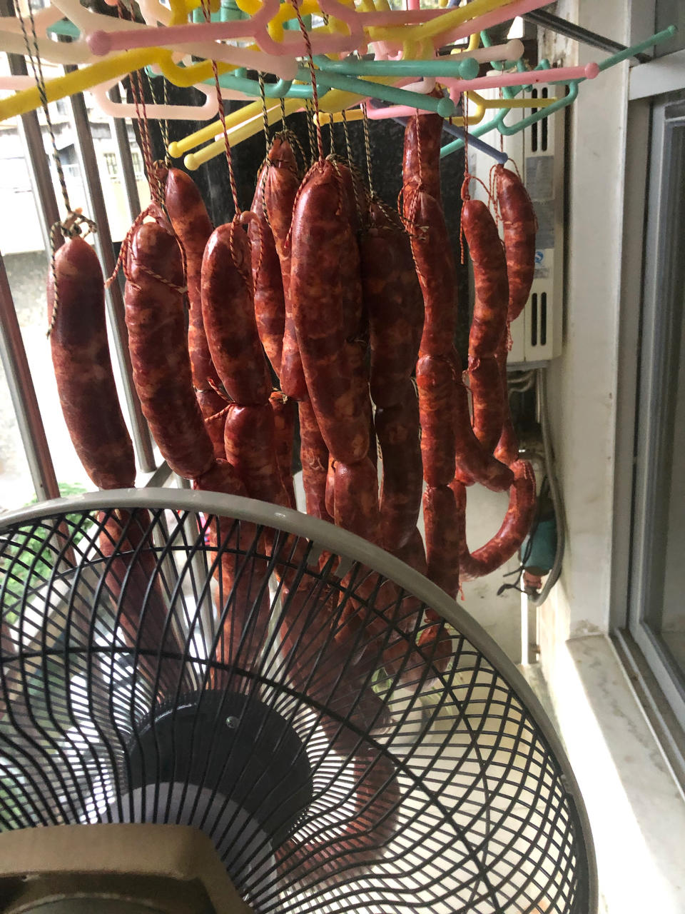 美珍爱烘焙 做过 四川麻辣香肠 12斤一半前腿肉、一半后腿肉。猪肉14元一斤,买二包蜀香调料、一包特麻中辣、一包中麻中辣。天气预报不准、只好用电风扇先吹着、今天小雨6~13度。 昨天赶集买土猪肉19元一斤,做8斤自调馅、冰糖100g、盐73g、胡椒粉、(花椒、辣椒)打粉、红烧酱油少许。 2021-12-29