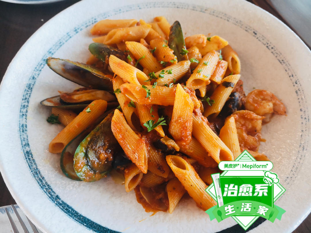 1.意大利面:相信大家并不陌生。意大利面有很多种形状,这是其中一种。搭配了海鲜虾仁,组成了一道海鲜意大利面。番茄,蒜泥必不可少。