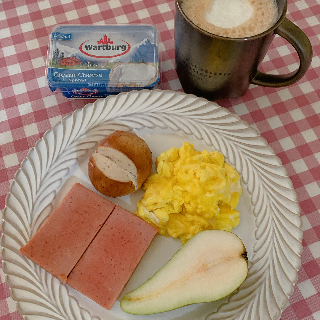 熊生家的小胖儿 做过 1月早餐马拉松 📅2022.01.03 北京 晴天☀️ 认认真真吃早餐 打卡第3天 ~ 🥣碱水包 涂抹奶酪🥣西式炒蛋 煎午餐肉🥣全脂奶咖啡 啤梨睡了个懒觉 快9点才起床 开心 ~ #早餐•2022年1月3日# 2022-01-03