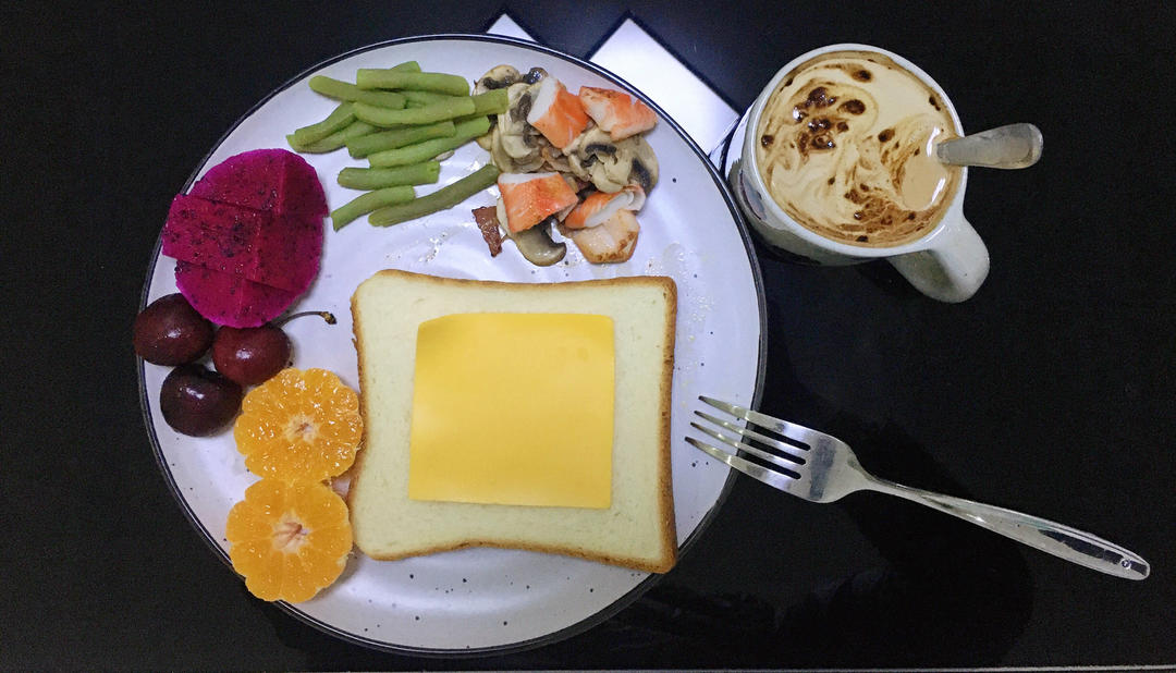 土司芝士,水果,煮四季豆,蘑菇培根蟹柳,无糖拿铁。