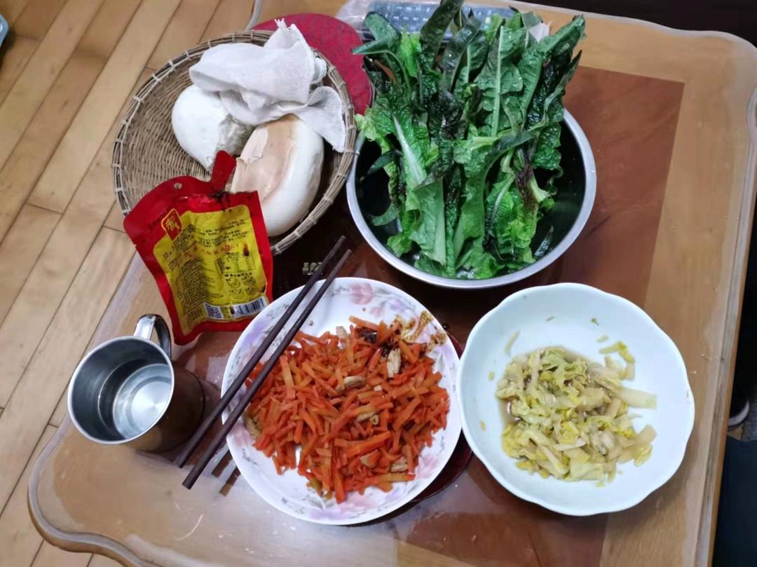胡萝卜炒肉,炖白菜。莴笋叶子配香其酱。馒头。