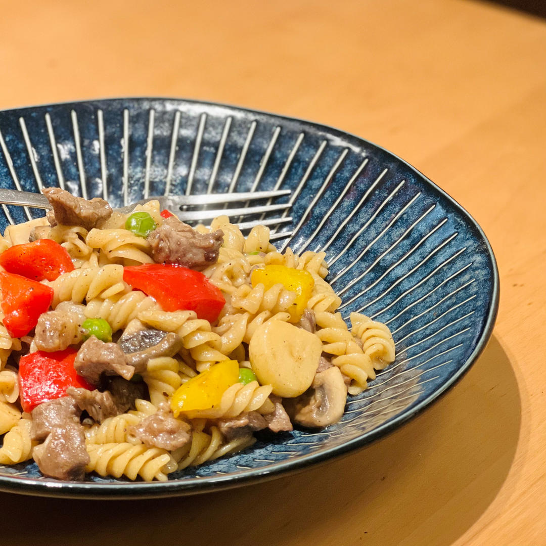 黑胡椒牛肉粒杏鲍菇炒意面