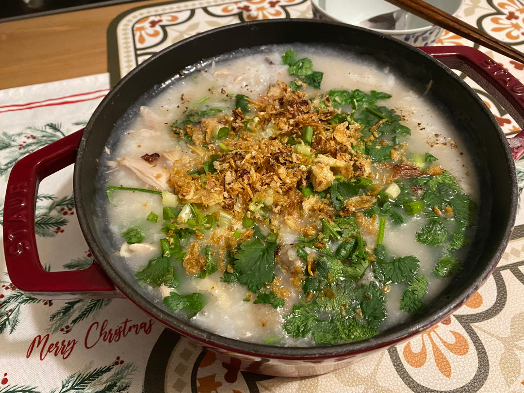 MissCrisTina 做过 晚餐•2022年1月10日 周末的两天四顿饭早:减配版本北非蛋 放了蘑菇青豆串番茄和西班牙红肠晚:大蒜辣椒意面 加了蘑菇以及上海青牛肉丸汤晚:越南鸡粥+蔬菜烤海鲈鱼#晚餐•2022年1月10日# 2022-01-10