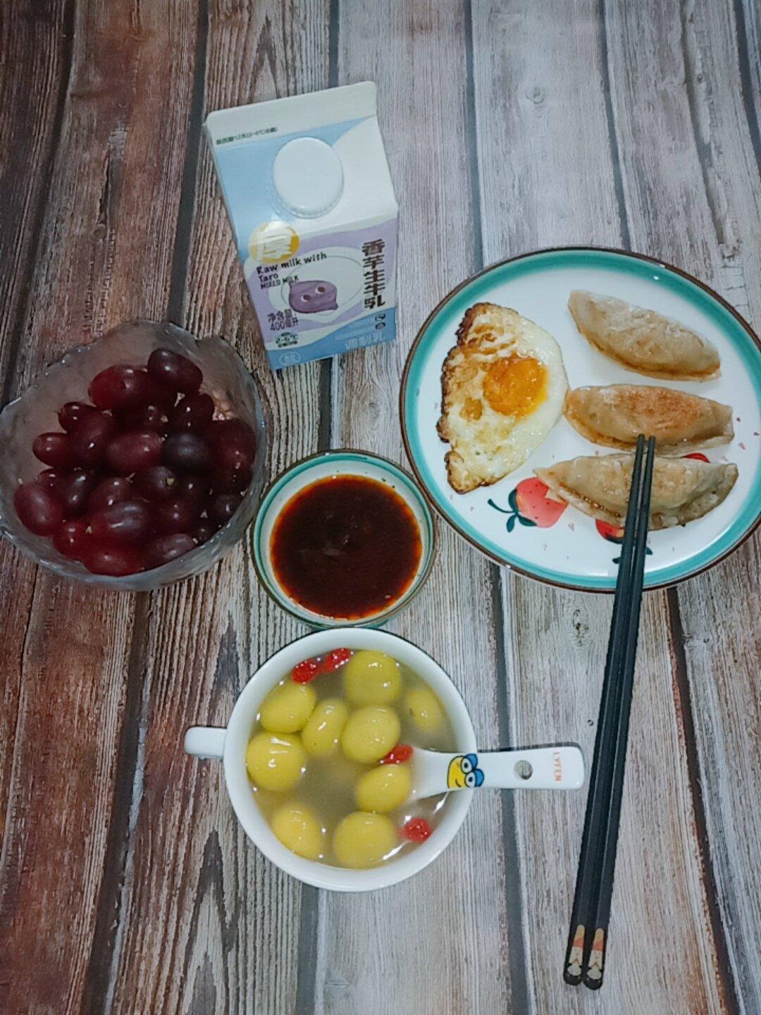 今日份早餐:红豆小米汤圆&煎饺荷包蛋&香芋牛乳&小提子