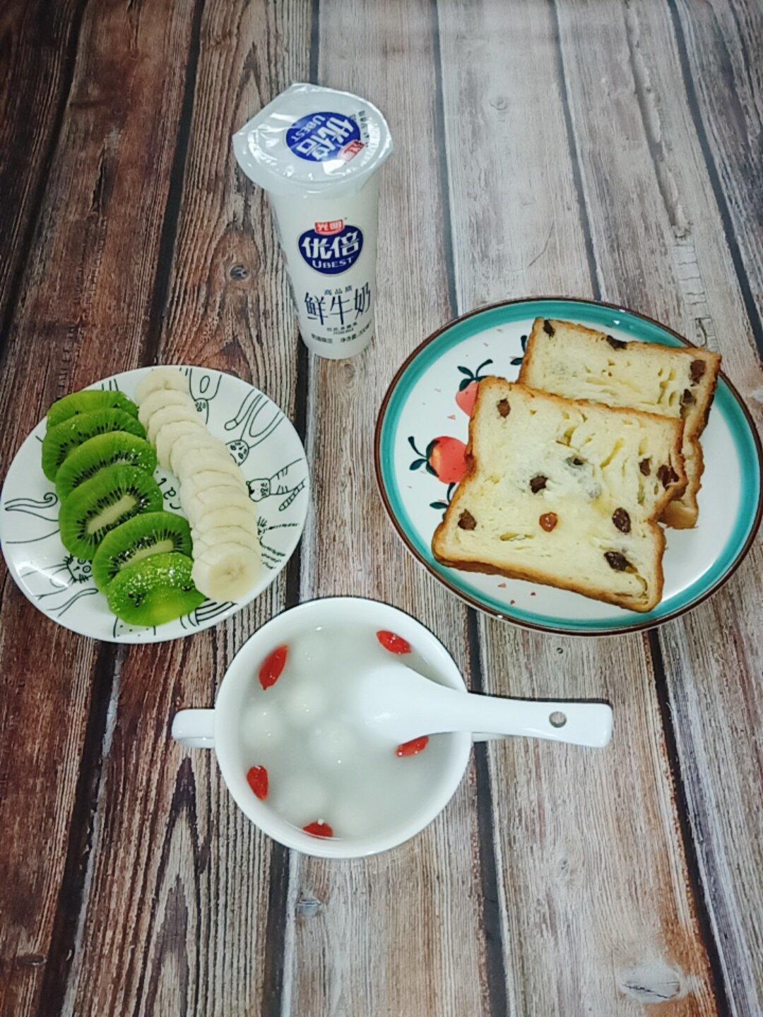 今日份早餐:酒酿小圆子&吐司&香蕉猕猴桃&牛奶