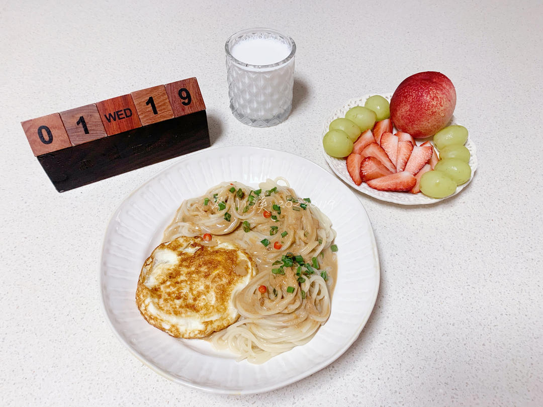 岑小溪 做过 2022年01月19日 20220119麻酱拌面芝麻酱花生酱温水化开搅匀热油爆香葱白加酱油关火倒入和匀的酱搅拌碱面煮熟拌入酱料🌟 暖暖嚯嚯几口清盘完了还要嘱咐以后不要做这些高热能的食物给我 2022-01-19