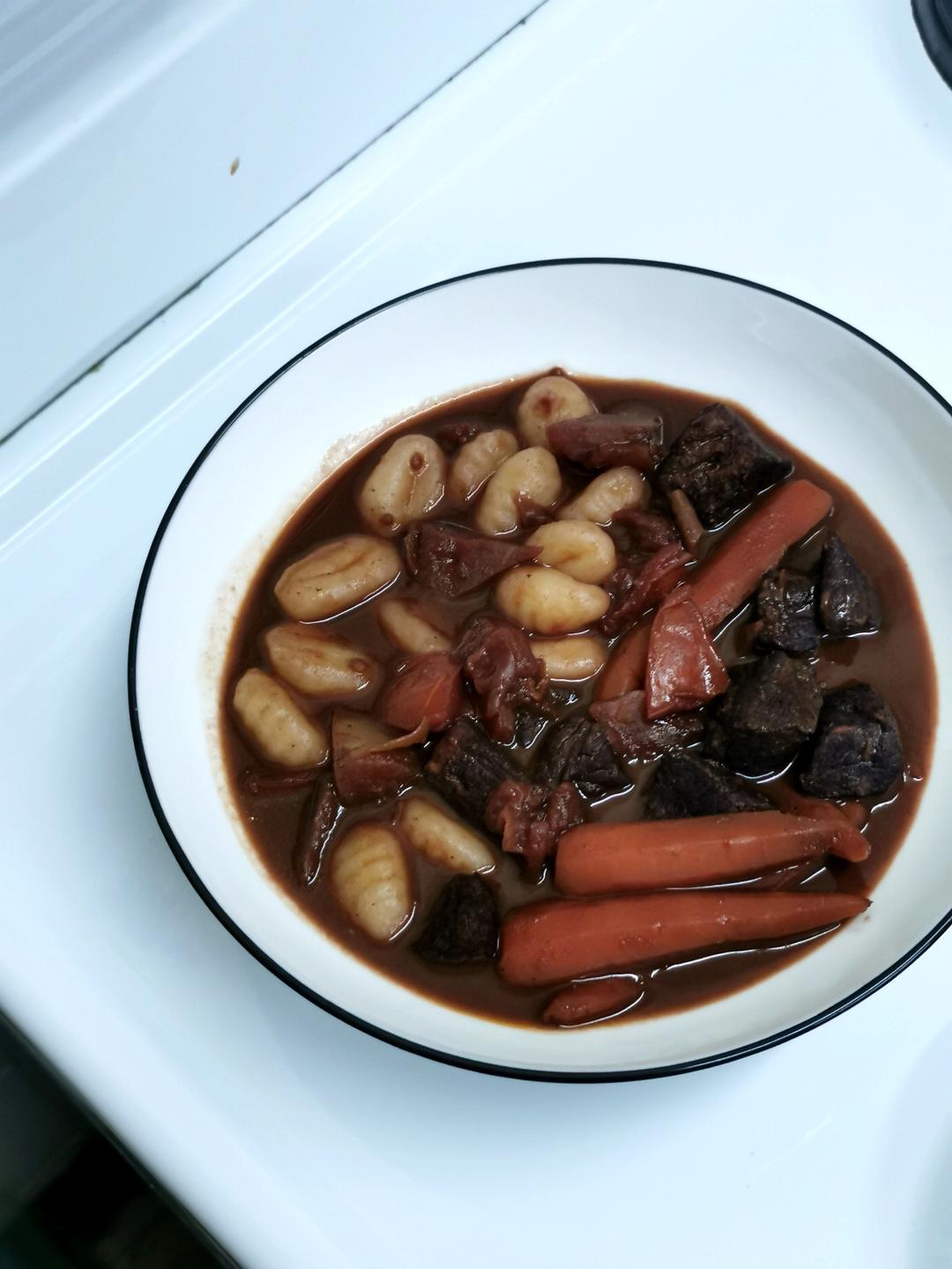黄油煎牛肉至焦黄,盛出。炒胡萝卜和西红柿,我的天,小火就好了!放入香叶、番茄膏、牛肉,倒入红酒没过食材,转大火。沸腾后转小火,炖煮1小时,快出锅时加入gnocchi;)