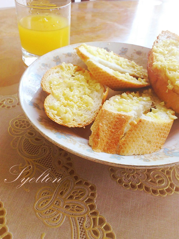 没有放绿的东西,但是蒜蓉和黄油先用微波炉爆了一下,之后抹上再烤,更加香了~