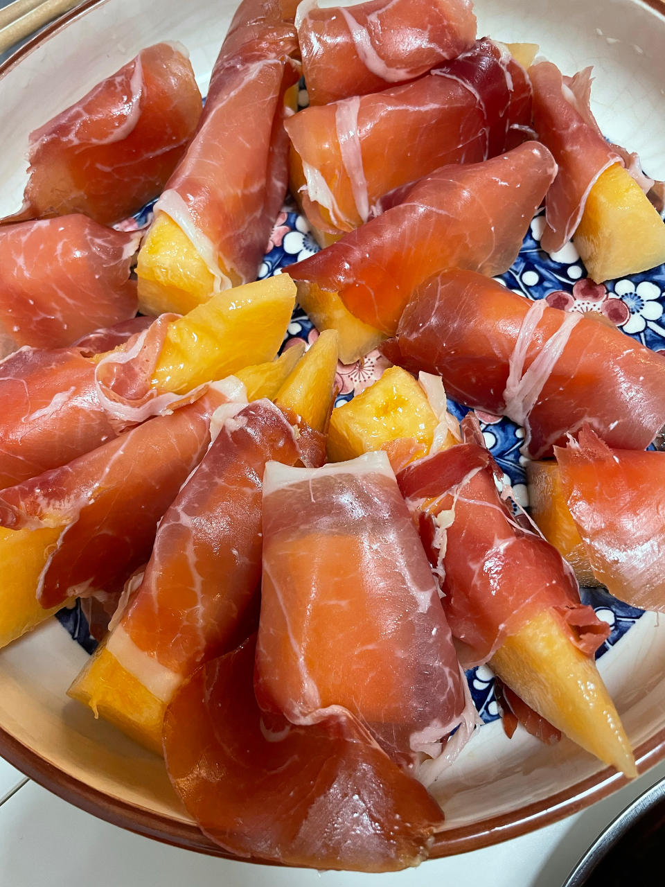 西班牙火腿配哈密瓜,天天的瓜肉中和了咸咸的火腿,就是摆盘不够讲究,见谅#午餐•2022年1月24日#
