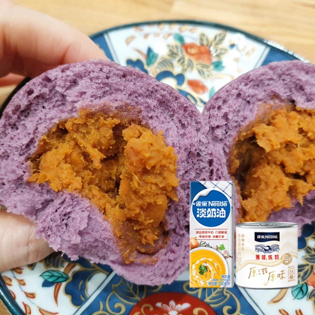 两个西瓜红地瓜蒸熟加一大勺雀巢太妃酱炼乳拌匀当馅儿,奶香浓郁,香甜美味。