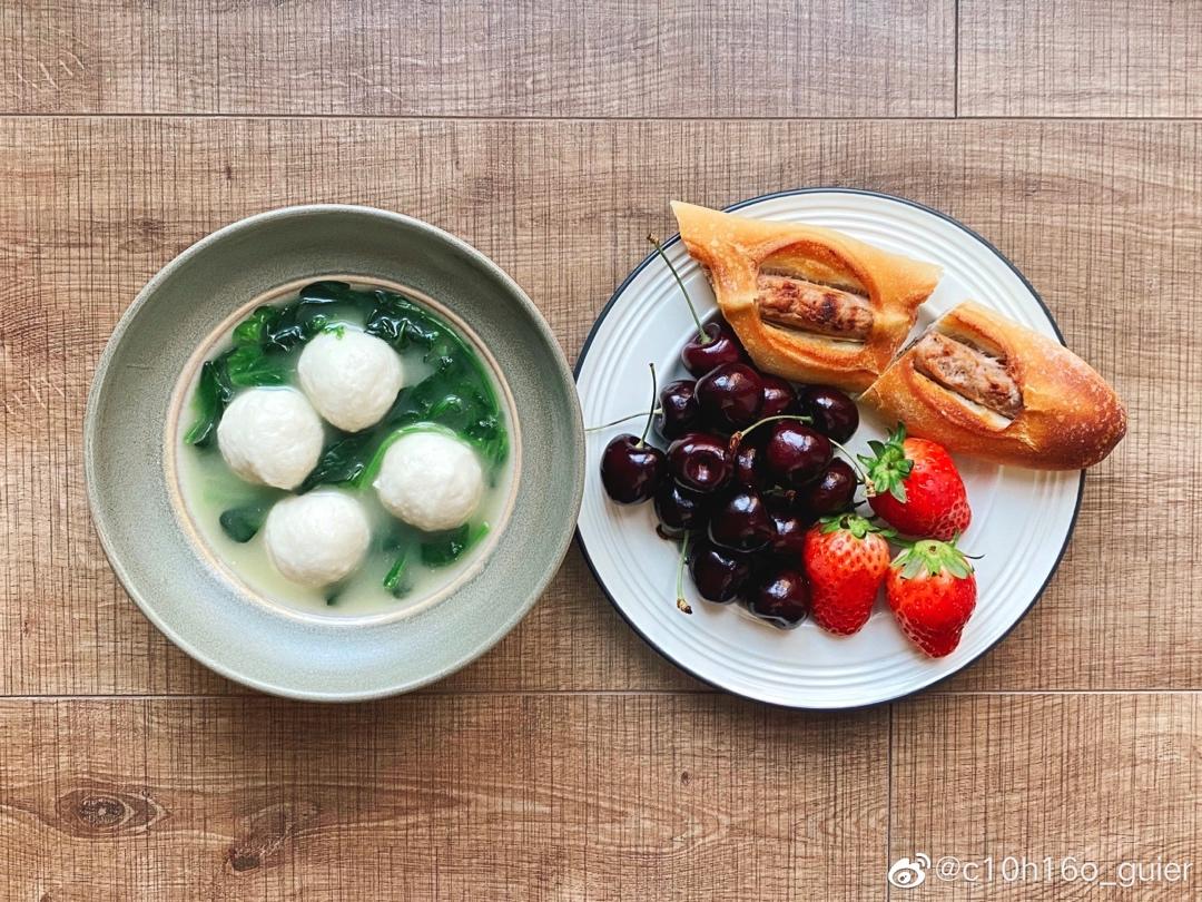 菠菜鱼丸汤🍲&德式热狗🌭&草莓🍓车厘子🍒