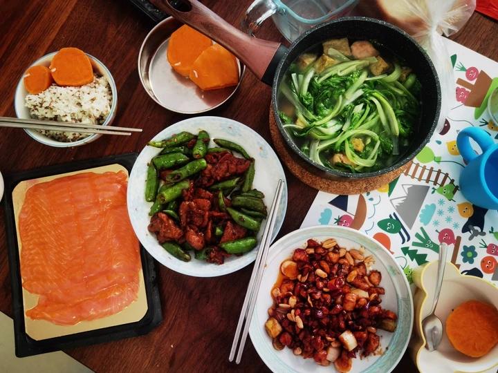 #午餐•2022年2月4日# 宫保鸡丁 杭椒牛柳都是买的盒马半成品,昨天家里临时亲戚来我买给我妈我妈又没有做又还给我了,半成品好省事儿,我想自己也可以研究一下这个备菜思路,平时攒俩菜上班接娃回家一扒拉多么省事,但这些有辣椒对娃不太友好,还得来点清淡菜式。小白菜汤打扫了冷冻室里的高汤,多半是排骨的吧我也不记得了。三文鱼买的是山姆的。 一天吃一顿饭算了吃的顿多了真的累(-_-) zzz 顿顿有剩顿顿收拾