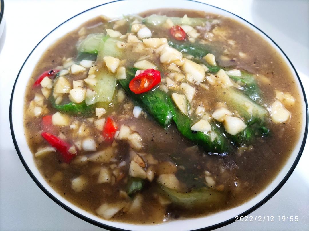 阿来333 做过 2022年02月13日 自制~蚝油青菜水热后加入青菜搞熟,起锅烧热油加入辣椒,蒜头炒香,加入淀粉水,蚝油,鸡精,盐搞料子。味道还行,有点淡,辣椒不够。颜色不好看。以后慎用生粉,黏糊糊的,做不出蚝油蒜末酱的效果。 2022-02-13