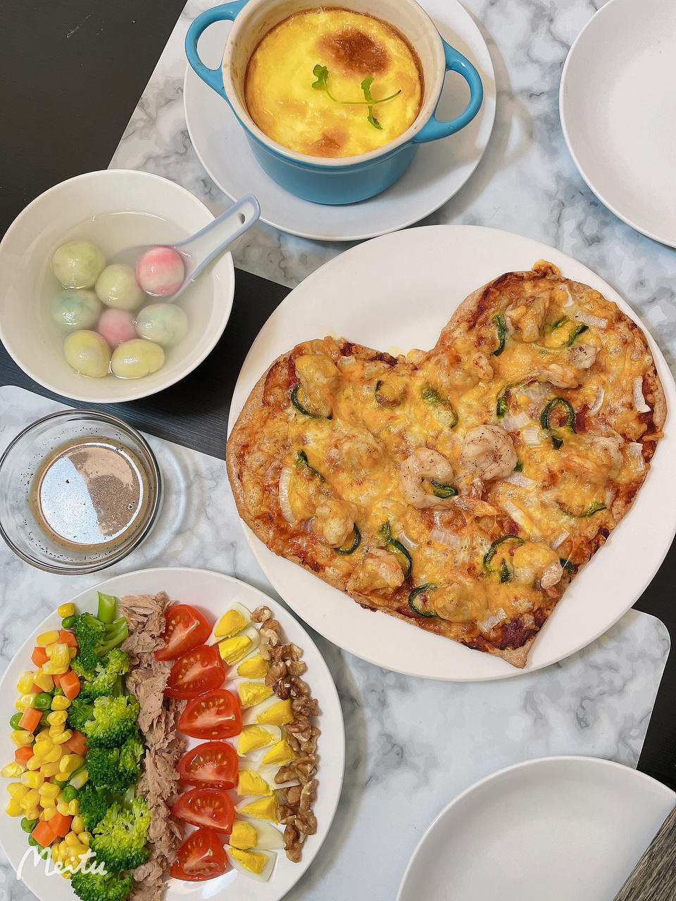 forestbaking 做过 晚餐•2022年2月13日 🤣提前过节了……❤大虾披萨,cobb salad,烤布丁🍮(其实就是蛋挞液),大理石汤圆糊弄了四种馅儿(豆沙、巧克力、芋头、黑芝麻)。#晚餐•2022年2月13日# 2022-02-14