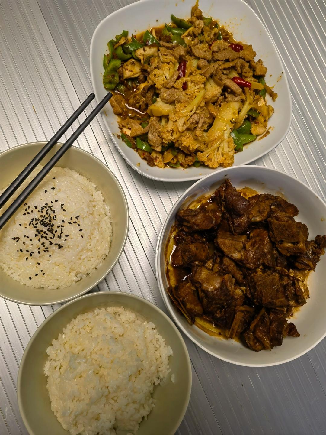 红烧排骨,孜然炒肉烩菜花,米饭