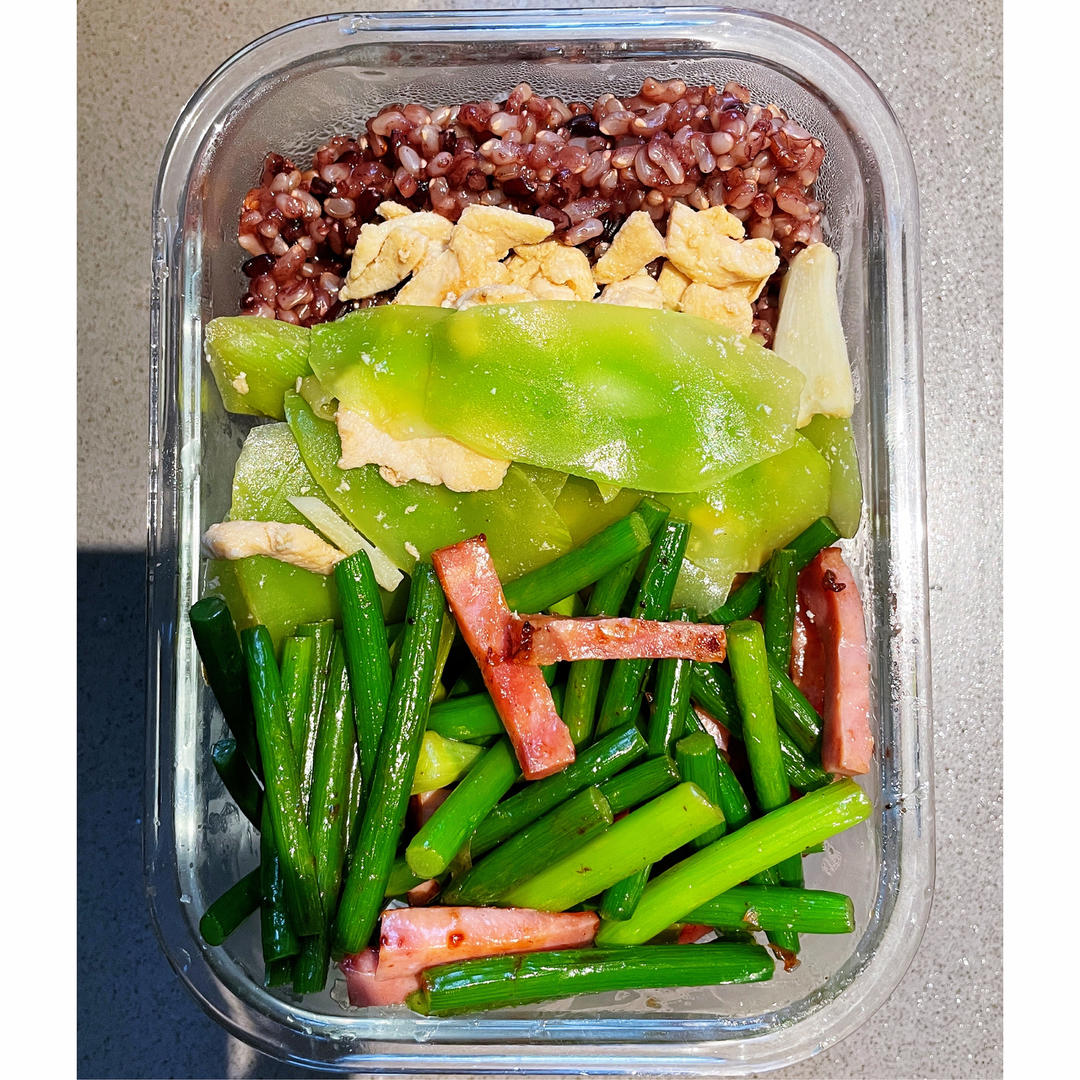 Watson2333 做过 午餐•2022年2月17日 #午餐•2022年2月17日# #便当便当# 莴笋炒肉 蒜苔炒香肠 三色糙米两周控制饮食加运动还是有效呢,肚子没有那么肿大了,坚持 2022-02-17