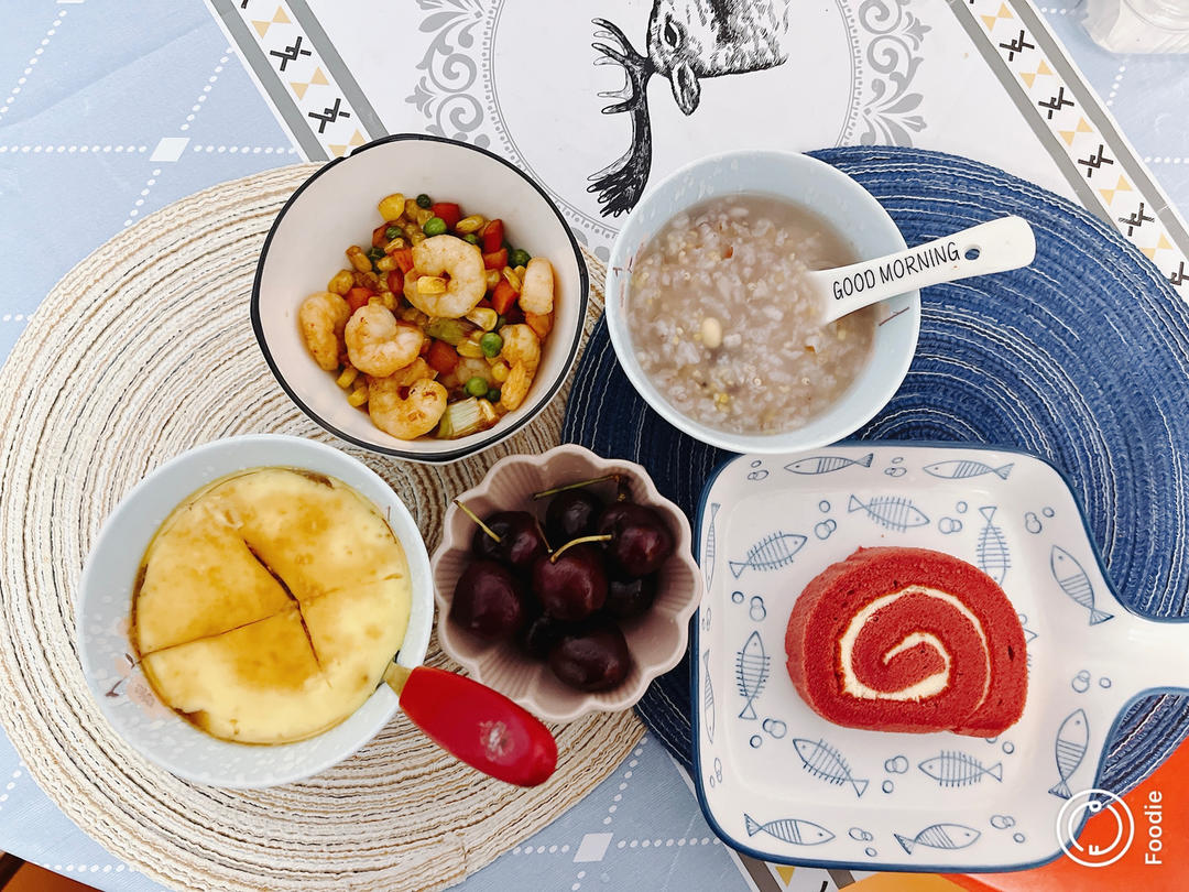 瑞士卷,杂蔬虾仁,蒸蛋,八宝粥,车厘子