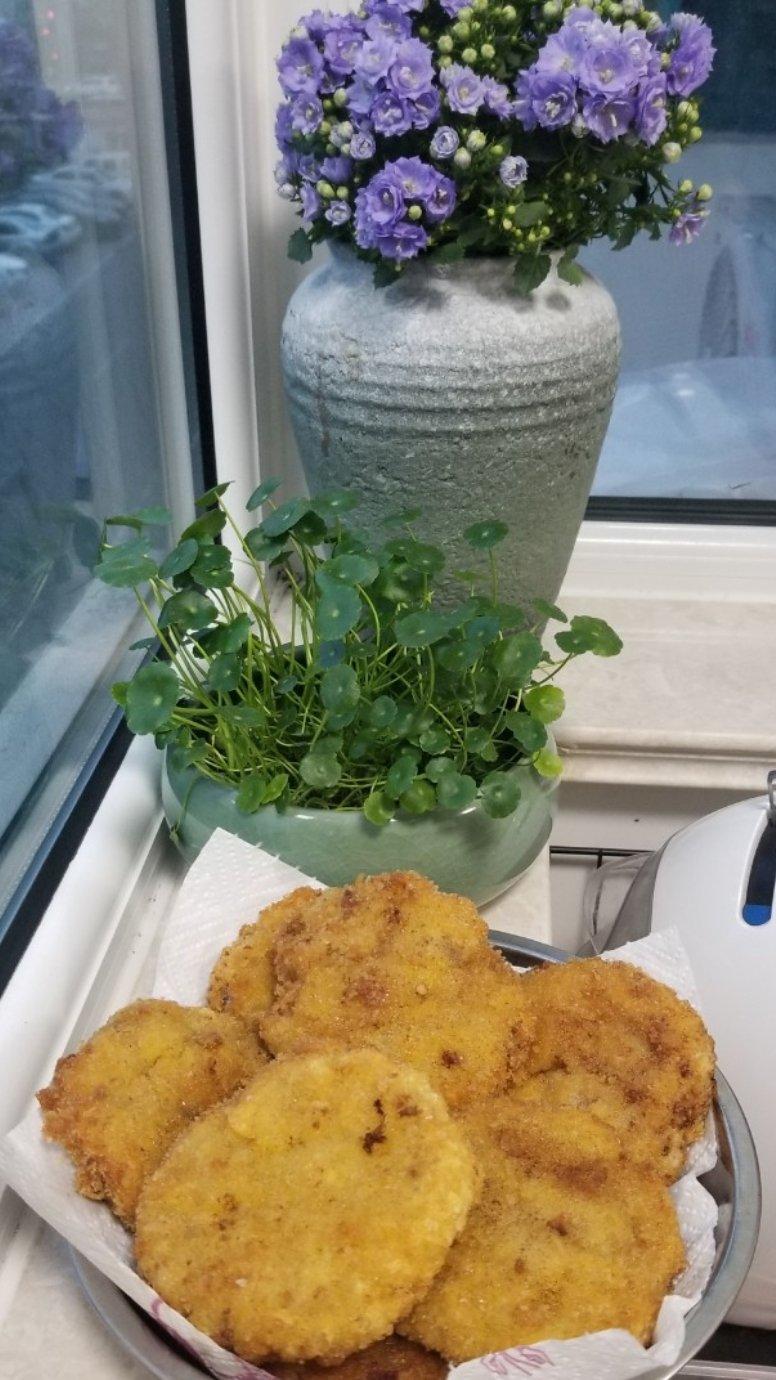 两条狭鳕鱼。用油炸的,鱼肉没放淀粉,大获成功!洋葱绝对是关键。
