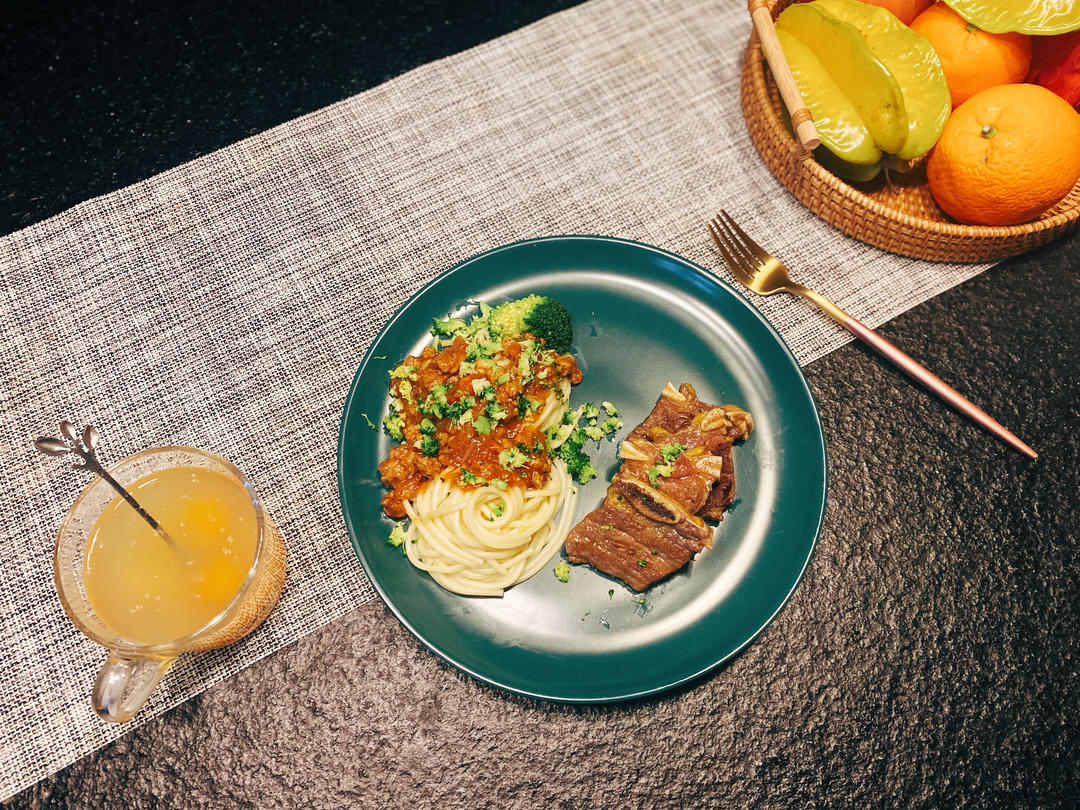 意面,香煎牛仔骨,金桔茶