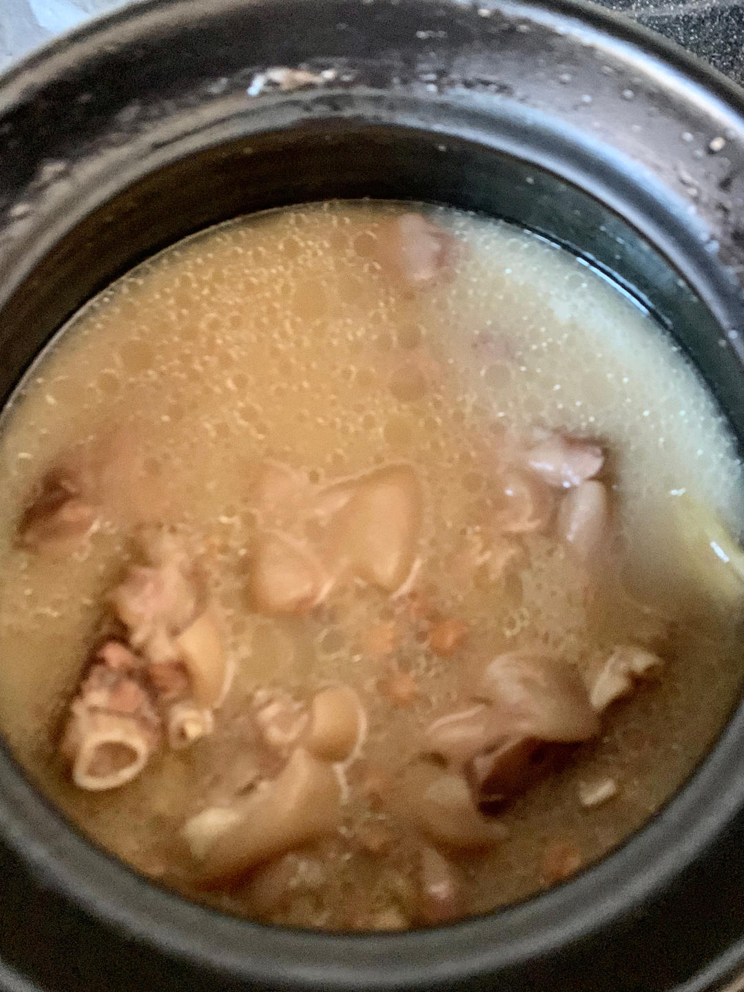 _晴天公仔_ 做过 黄豆花生猪脚汤 黄豆隔夜浸泡,用了两盒猪蹄,拔毛洗净,冷水入锅放姜片料酒焯水,再次洗净,尤其是犄角旮旯的地方,清除未净的猪毛。然后放入砂锅,洗净的黄豆、花生,黄芪、当归、红枣三颗,还有葱姜、花雕酒,一次性加凉水加足,开大火煮,水沸后转中小火,在锅盖油封的状态下,炖煮两个小时15分钟左右,其间不时开盖翻动一下,以防粘锅(炖煮1个小时左右把葱挑出来扔掉,以防长时间炖煮会有葱臭味),最后放入洗净的枸杞和盐调味,再次沸腾即可关火。 2022-03-11