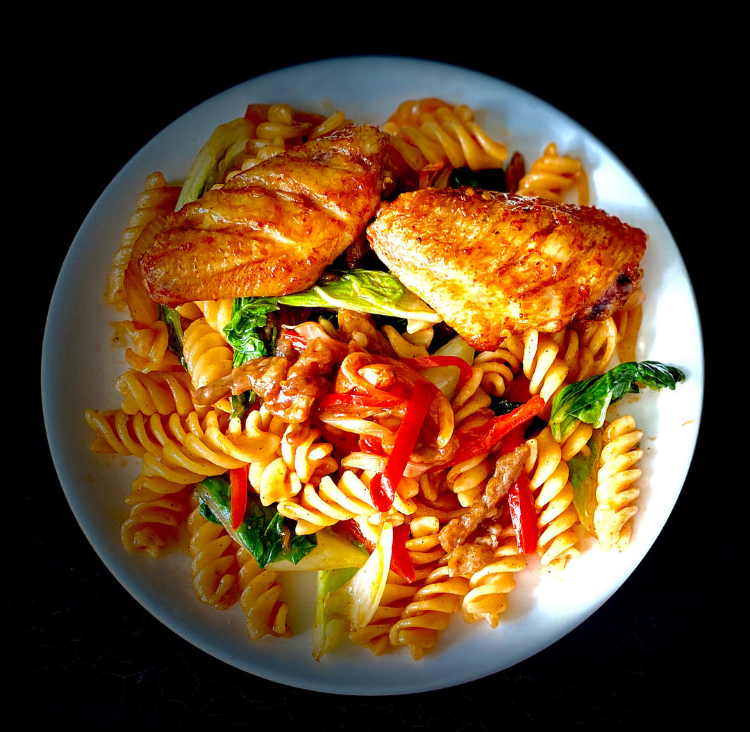 黑椒牛肉烤鸡翅版,家里没有西兰花换成了小青菜。