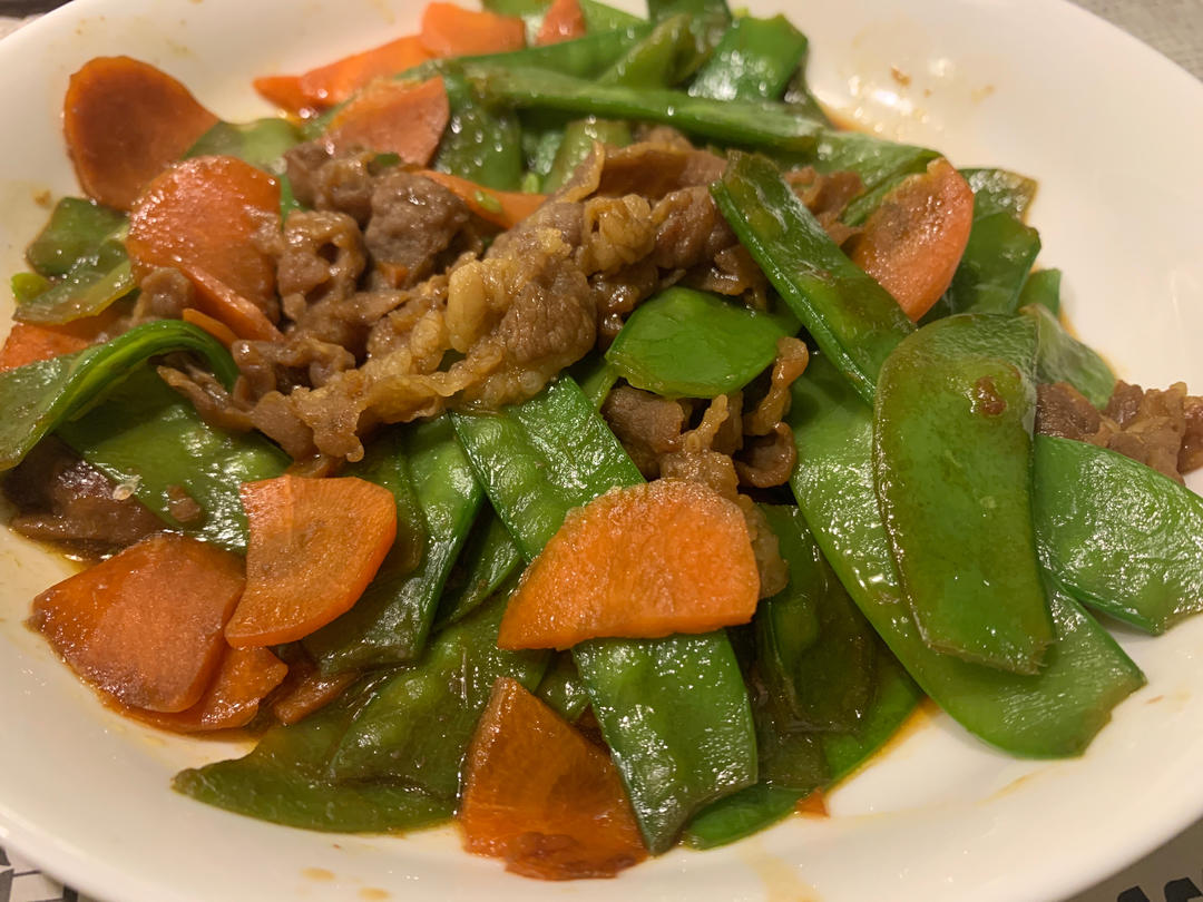水梨13 做过 嫩炒牛肉片~~简单快手菜 用的肥牛片100克+荷兰豆250克+半个胡萝卜。#晚餐•2022年3月27日#肥牛加入2勺生抽+1勺蚝油+1勺淀粉+1勺油腌制备用。荷兰豆去筋焯水2分钟再入冰水降温备用。胡萝卜切片备用。少油小火炒肥牛至熟盛出,锅倒少许油下胡萝卜炒熟,再倒入荷兰豆,翻炒均匀倒入少许酱油炒匀,再倒回肥牛炒匀出锅。 2022-03-27