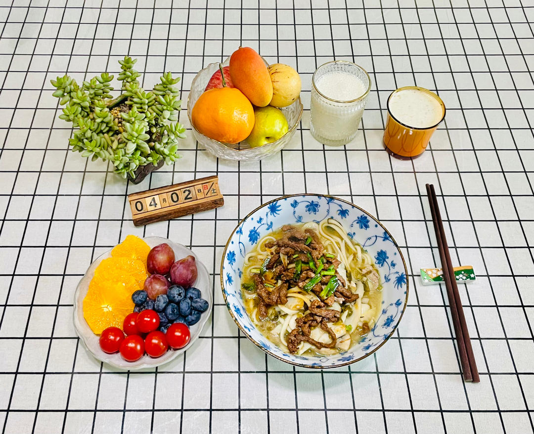B妈小厨 做过 4月早餐马拉松 20220402 星期六 农历三月初二好好爱自己好好爱家人给你爱的人做一份暖心的早餐是一件幸福的事早餐片儿川加牛肉牛肉蘑菇笋咸菜里脊肉新鲜的大蒜🧄橙子🍊蓝莓🫐小番茄🍅西梅打二杯香蕉🍌鲜牛奶🥛#早餐•2022年4月2日# 2022-04-02