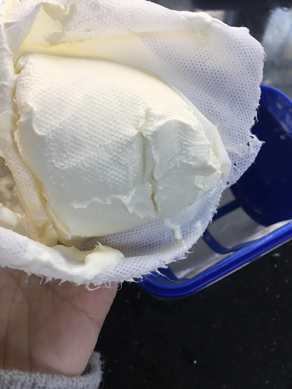 马斯卡彭做好了,400克淡奶油28克柠檬汁出了260克马斯卡彭,空口尝了一下有淡淡的柠檬香微酸👏🏻
