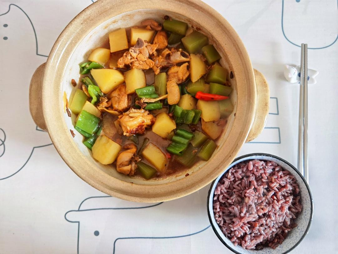黄焖鸡米饭。快长芽的土豆终于清空了。