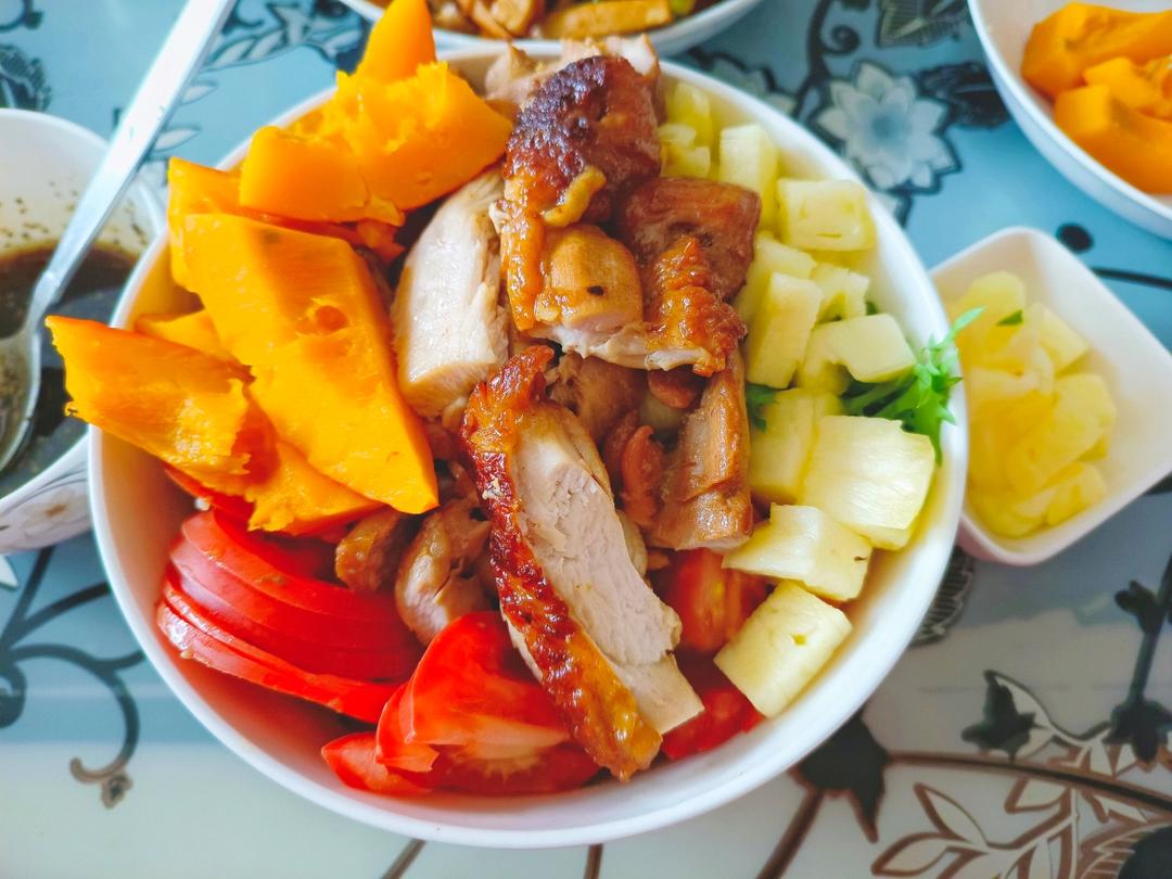 一小把苦菊(被埋住了 其实有满满一大碗的)➕一个照烧鸡腿肉(只吃了2/3 肉肉分量好足)➕很小的番茄一个➕拳头大小的小菠萝一个(酥的 好好吃😍)➕手掌大的一扇蒸南瓜。
