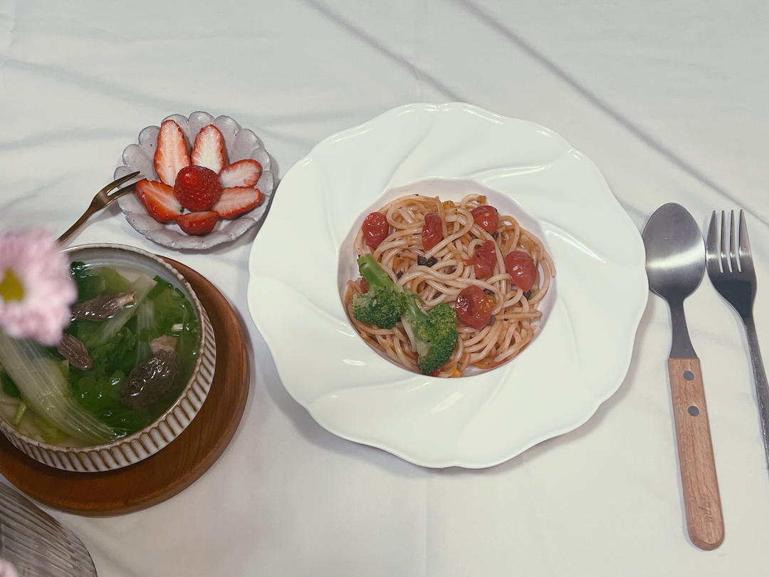 今晨,做了牛肉粒芝士意面🍝,煮了羊肚菌蔬菜汤,加上小可爱草莓🍓,美好的一天就这样开启!