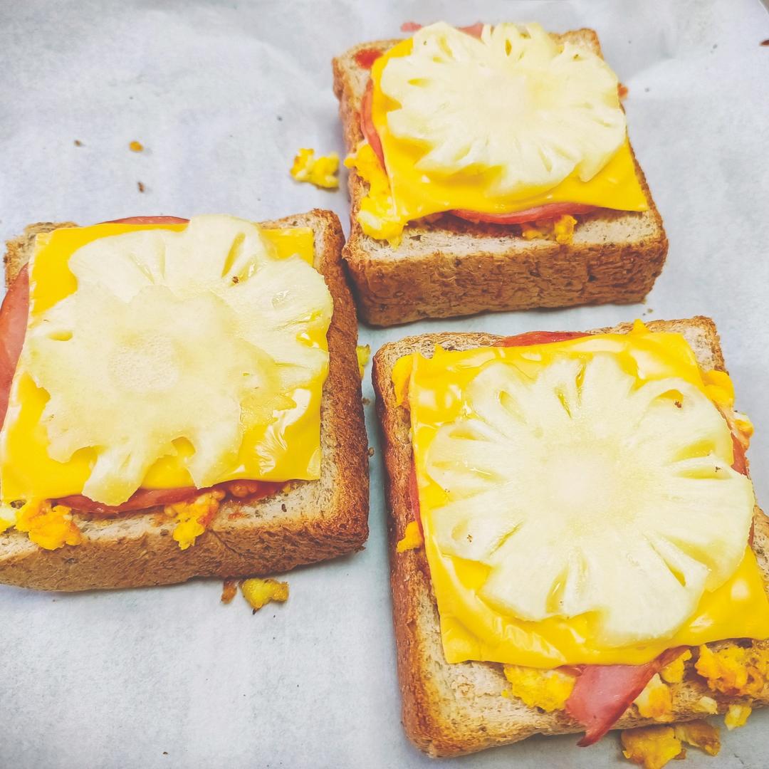 下顿吃啥好 做过 早餐•2022年4月9日 #早餐•2022年4月9日# 奇亚籽全麦迷你厚切片+牛奶炒蛋+火腿片+车达芝士片+小菠萝片。烤箱160° 8分钟囤了1kg芝士片,芝士自由啦✌️ 早餐是早起的唯一动力😂 2022-04-09