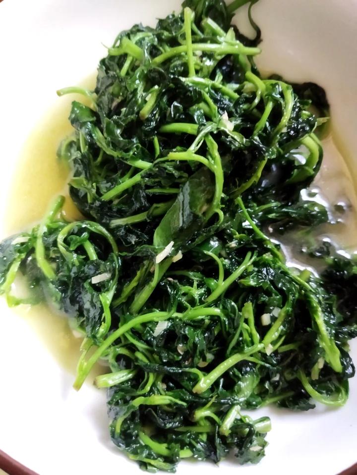 清炒枸杞芽:姜末爆香,加入清洗好的枸杞芽和绍酒、盐、糖,急火快炒,噼里啪啦,出锅盛盘。