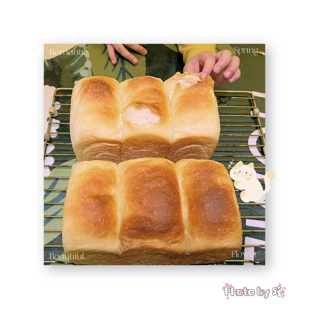 璐璐is無尾魚 做过 白吐司(450克模具两个量、健康早餐吐司) 一发忘了时间有点过了,二发长得不太高,好在味道还是很绵软,小朋友忍不住手撕吃了一大块。上火170°下火190°,最下层,烤了30分钟也没什么颜色,最后又换到上下火180°,高糖盒烤了5分钟,金波纹烤了10分钟。#早餐•2022年4月11日# 2022-04-11