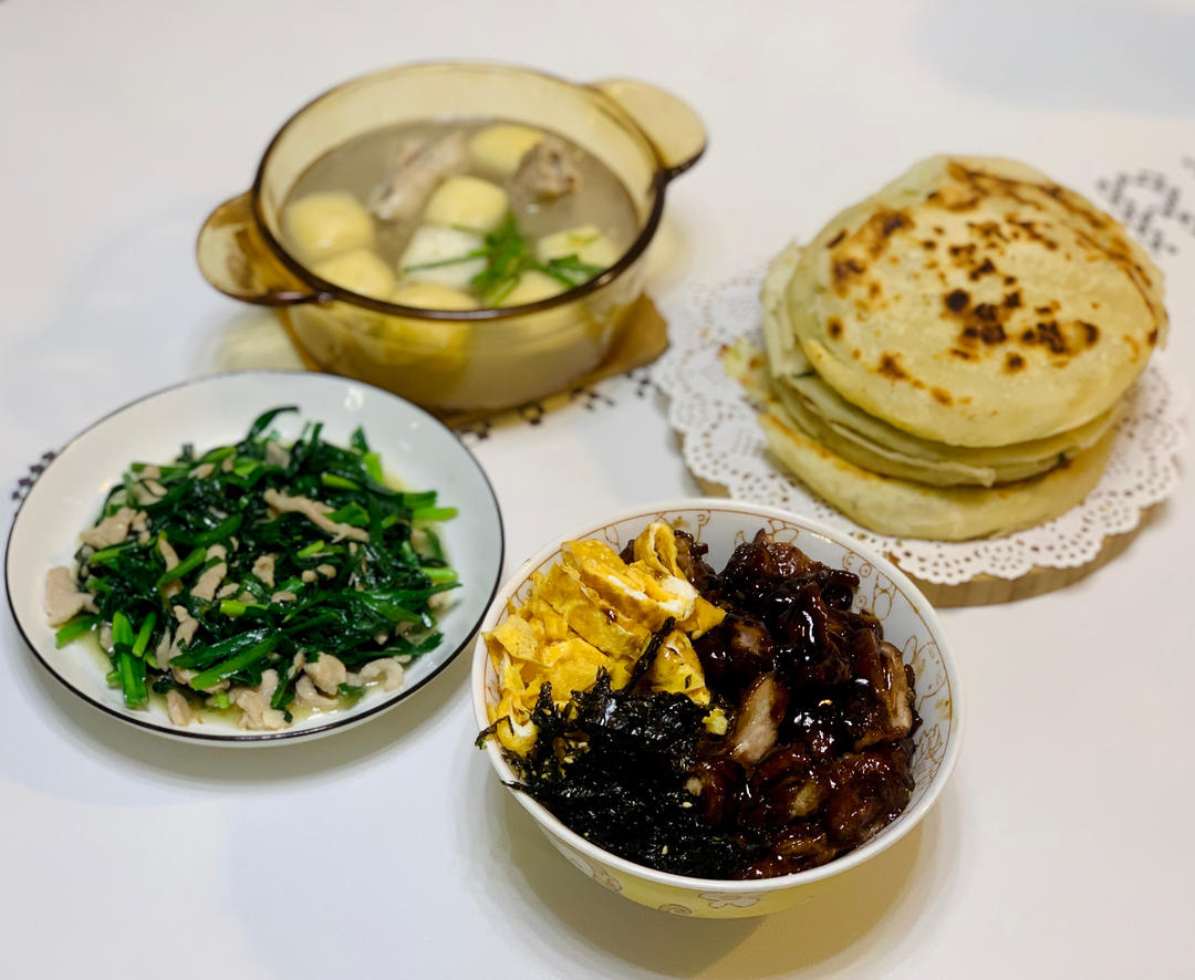 贤妻小呆驴 做过 FK在家的简餐 #晚餐•2022年4月15日# #封控中的美食# 今天我们楼里组织团购了面粉 我是面粉小白 平时也就用来洗洗水果 做做鸡蛋饼 邻居收到面粉后又给我投喂了烙饼😄 这几天牛奶和鸡蛋自由后 心血来潮做了布丁 没有奶油 口感真的差很多 自己尝了一个后决定不送邻居了😂自己用紫菜炒了海苔 味道在线 与邻居分享了 晚饭照烧鸡腿饭 韭菜炒肉丝 排骨汤 2022-04-15