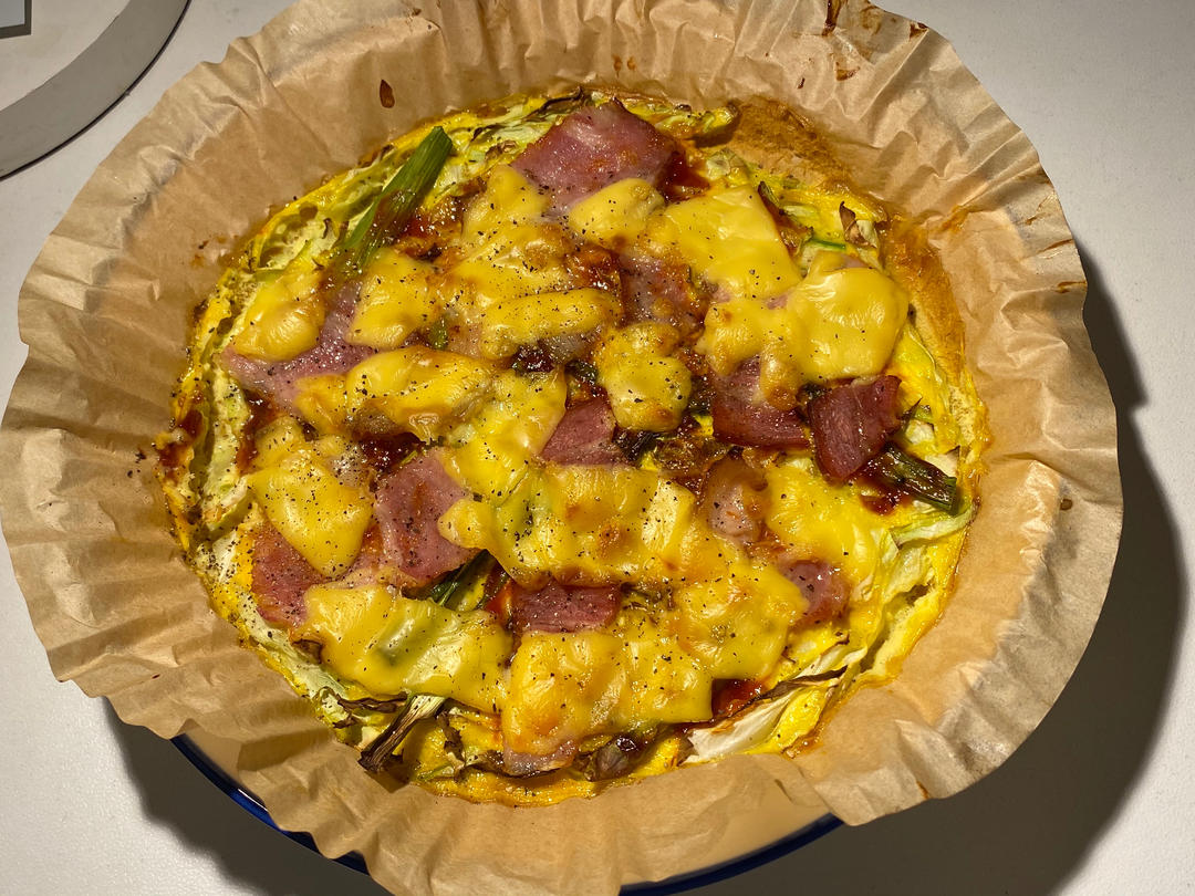 javierotarola_ 做过 日式卷心菜披萨 #午餐•2022年4月16日# 没完全按照菜谱做,采用了菜谱的饼底方子,空气炸锅先200度五分钟凝固,涂番茄酱混黑胡椒酱的披萨酱,撒芝士培根。蛮好吃的。 2022-04-16
