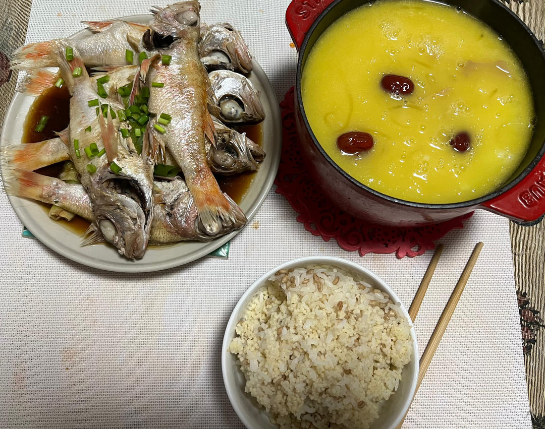 蒸鱼+花胶鸡汤+杂粮饭