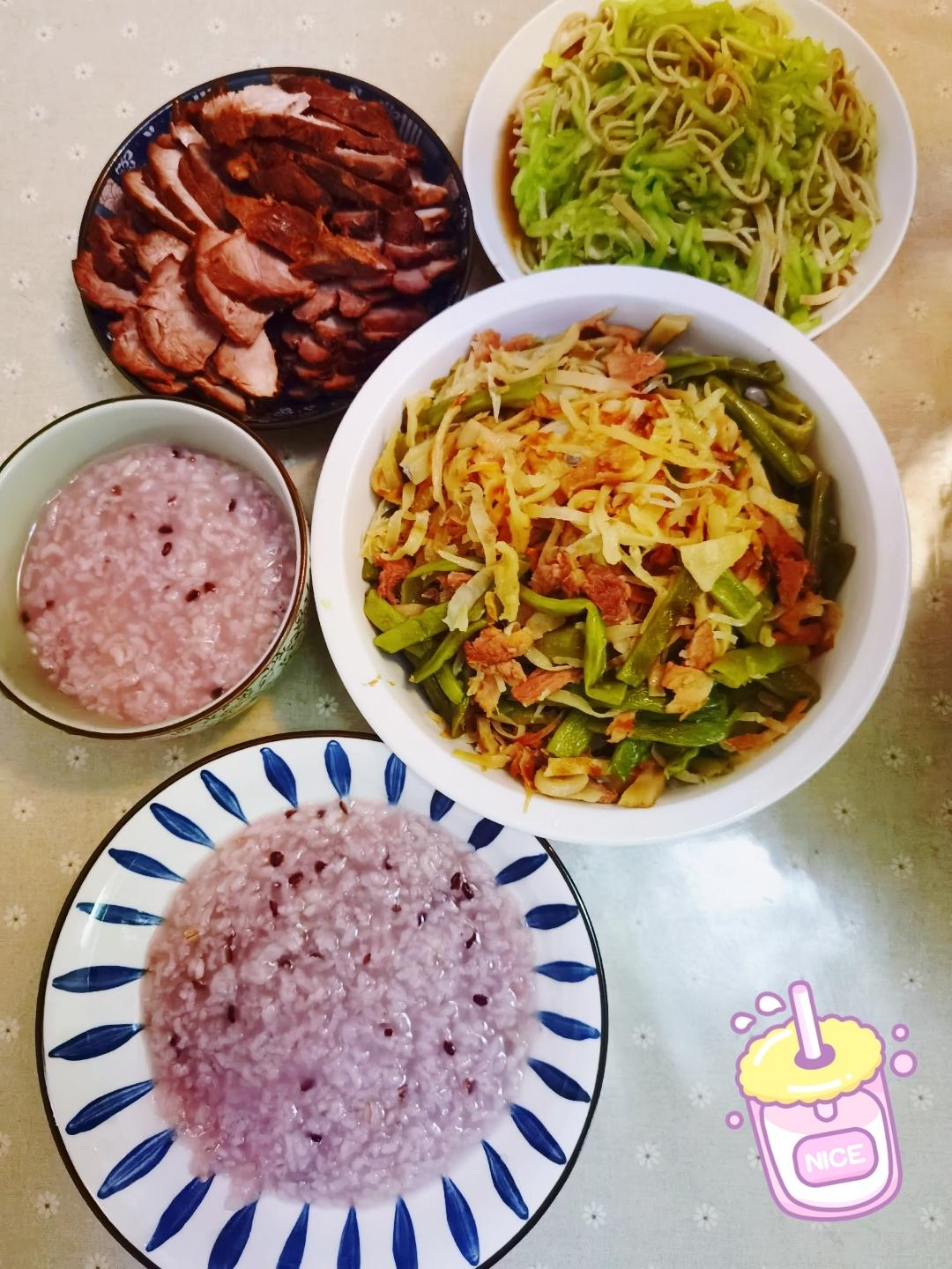 晚餐蹭爸妈做得:豆角焖饼、卤肉、黄瓜拌豆腐丝、杂粮粥~