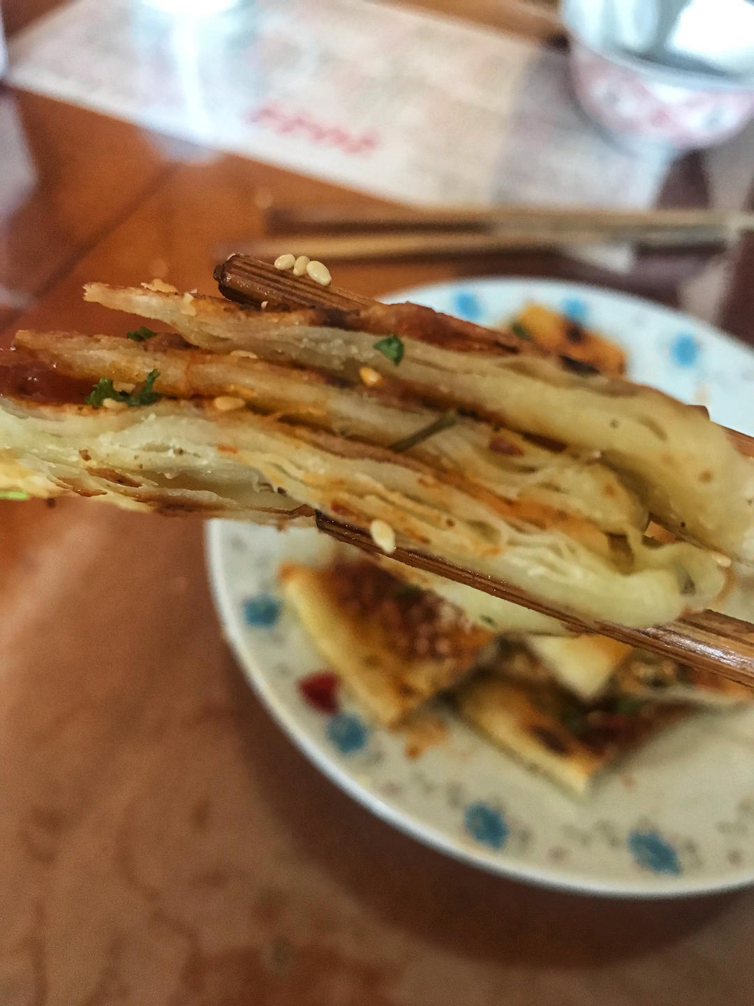 昨天晚上做好了两面先烙一下,早上起来涂油再煎一下,香脆!没有葱撒了点干香菜也很不错